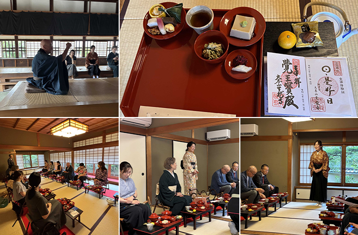 禅の組み方、心のもちようをご教示いただき、禅の歴史等を詳しく拝聴しました。昼食は天龍寺庭園内の「篩月」にてトーマス和尚を囲んで精進料理を美味しくいただきました。本当に和やかなひと時を過ごすことができました。